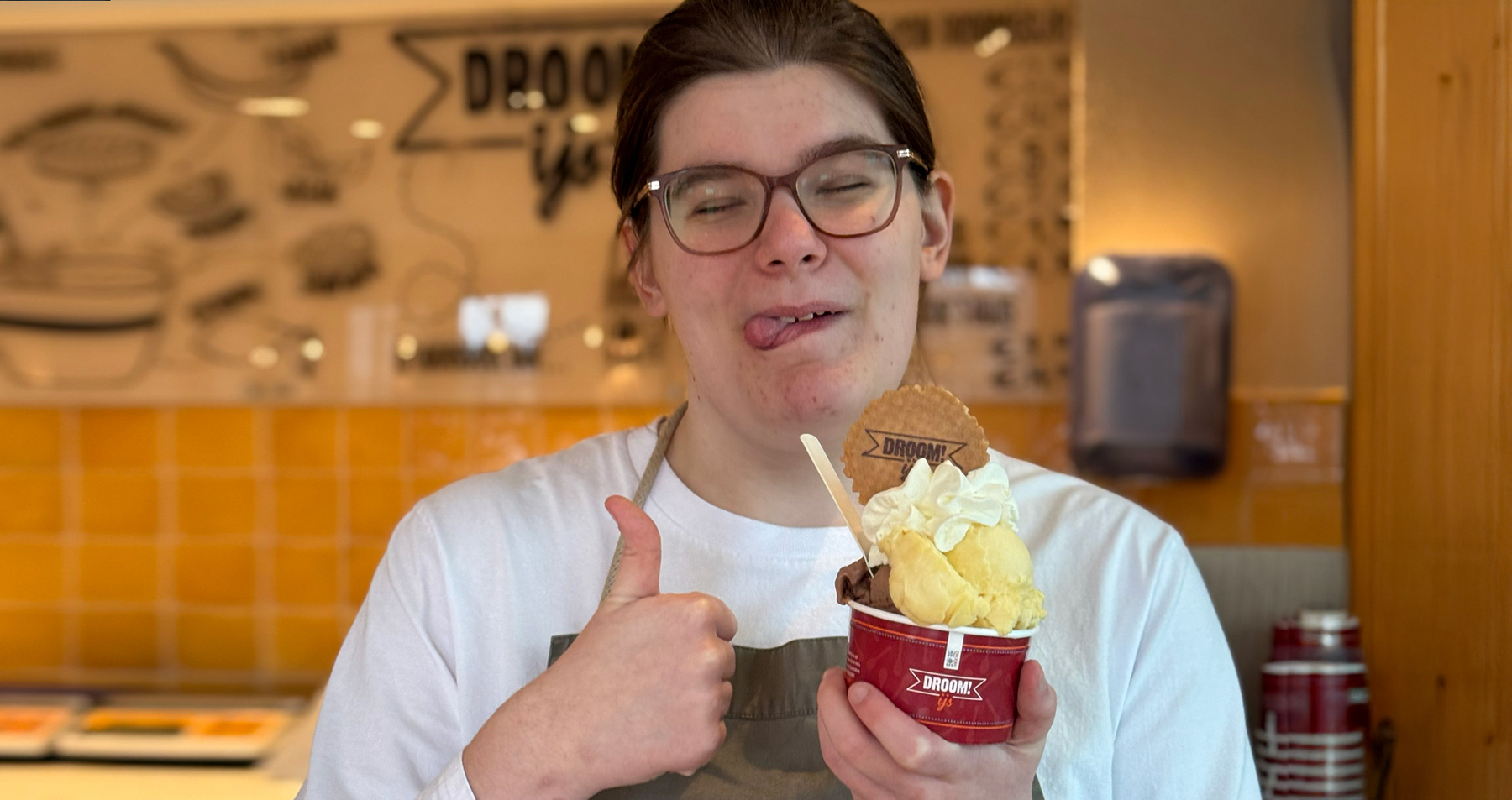 In 2023 kwam er zelfs een volgende stap, toen we in de entree van de nieuwe woontoren Thuishaven (Waalfront, Nijmegen-West) een eigen ijssalon openden! Dat gebeurt op de voor ons vertrouwde manier. Net als in het productieproces, bieden we namelijk ook in de ijssalon mensen met een afstand tot de arbeidsmarkt een springplank naar werk. Samen met het heerlijke ijs en de goede koffie, maken zij straks de unieke sfeer in de nieuwe ontmoetingsplaats die de ijssalon gaat worden!